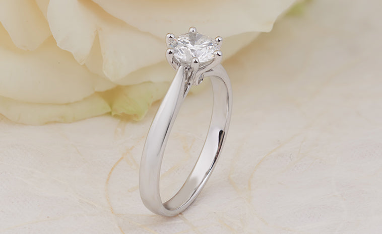 In a 6-prong setting, the metal prongs are generally more refined that a 4 prong, minimising the diamond coverage while maximising the surface area for light to infiltrate. It is recommended for diamonds 1 carat or over to have 6 prongs that secures the diamond safely in place.