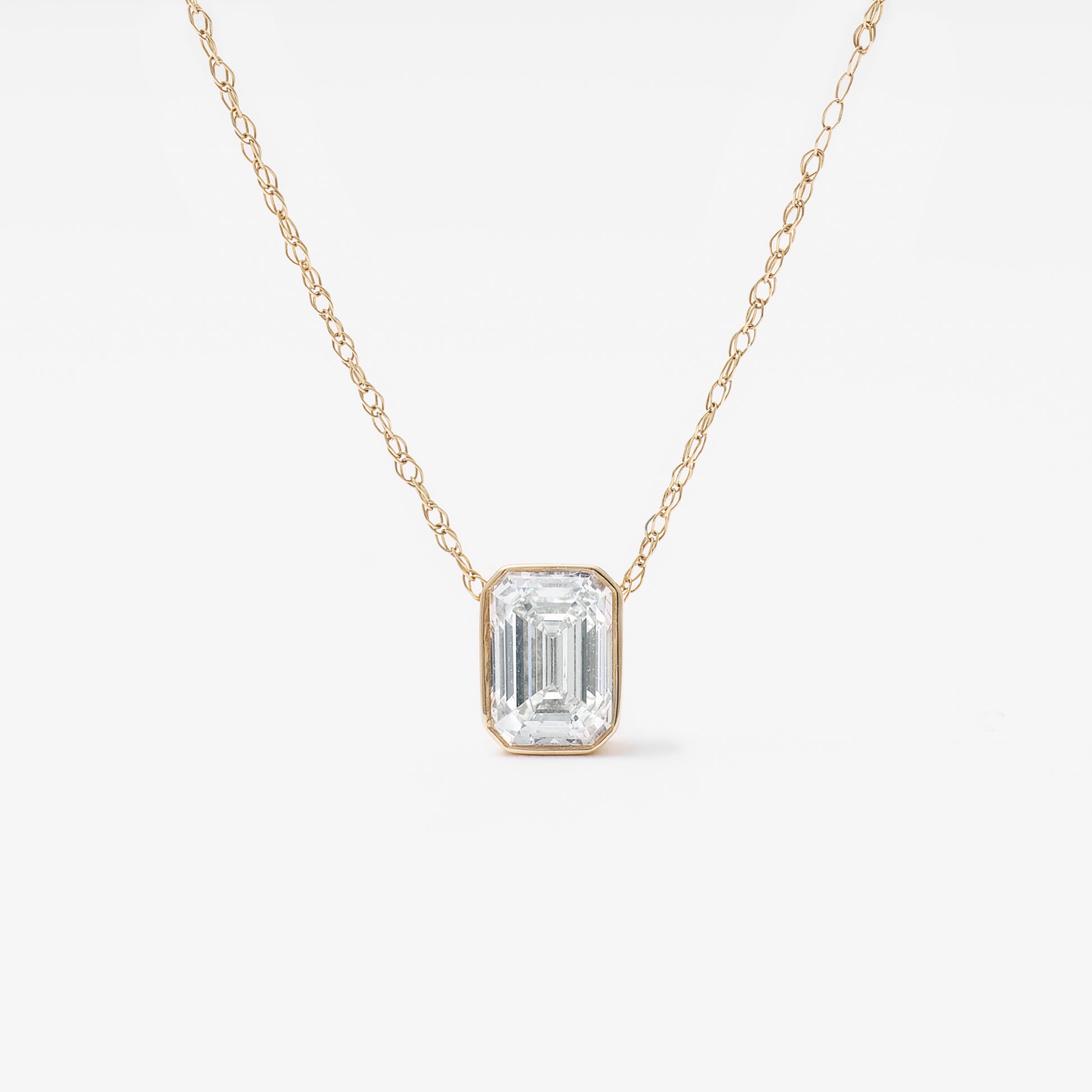 9K Yellow Gold 0.70ct Bezel Emerald Cut Lab Diamond Slider Pendant With Chain 45cm.