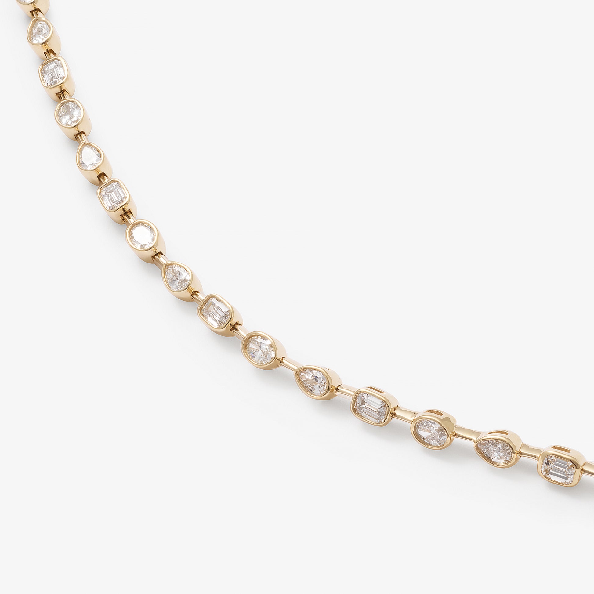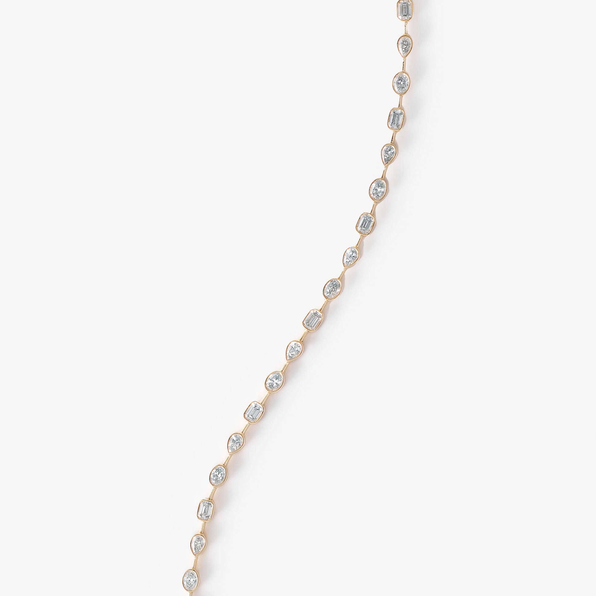 This exquisite tennis bracelet showcases a dazzling trio of cuts emerald, pear, and oval each lab grown diamond bezel set in a continuous line of brilliance. With a total diamond weight of 2.00ct, this piece delivers refined sparkle and contemporary elegance in equal measure. The bezel settings offer a sleek, modern frame for each stone, enhancing security and shine while creating a smooth, fluid silhouette along the wrist.