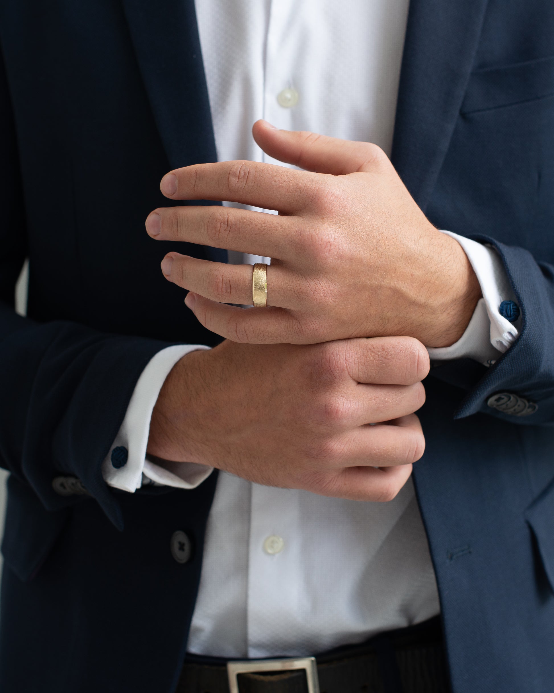A 7mm wide, solid gold band featuring a half round profile with bevelled edges, a crosshatch patterned finish through the centre and a slightly convex inner surface for a comfortable fit.