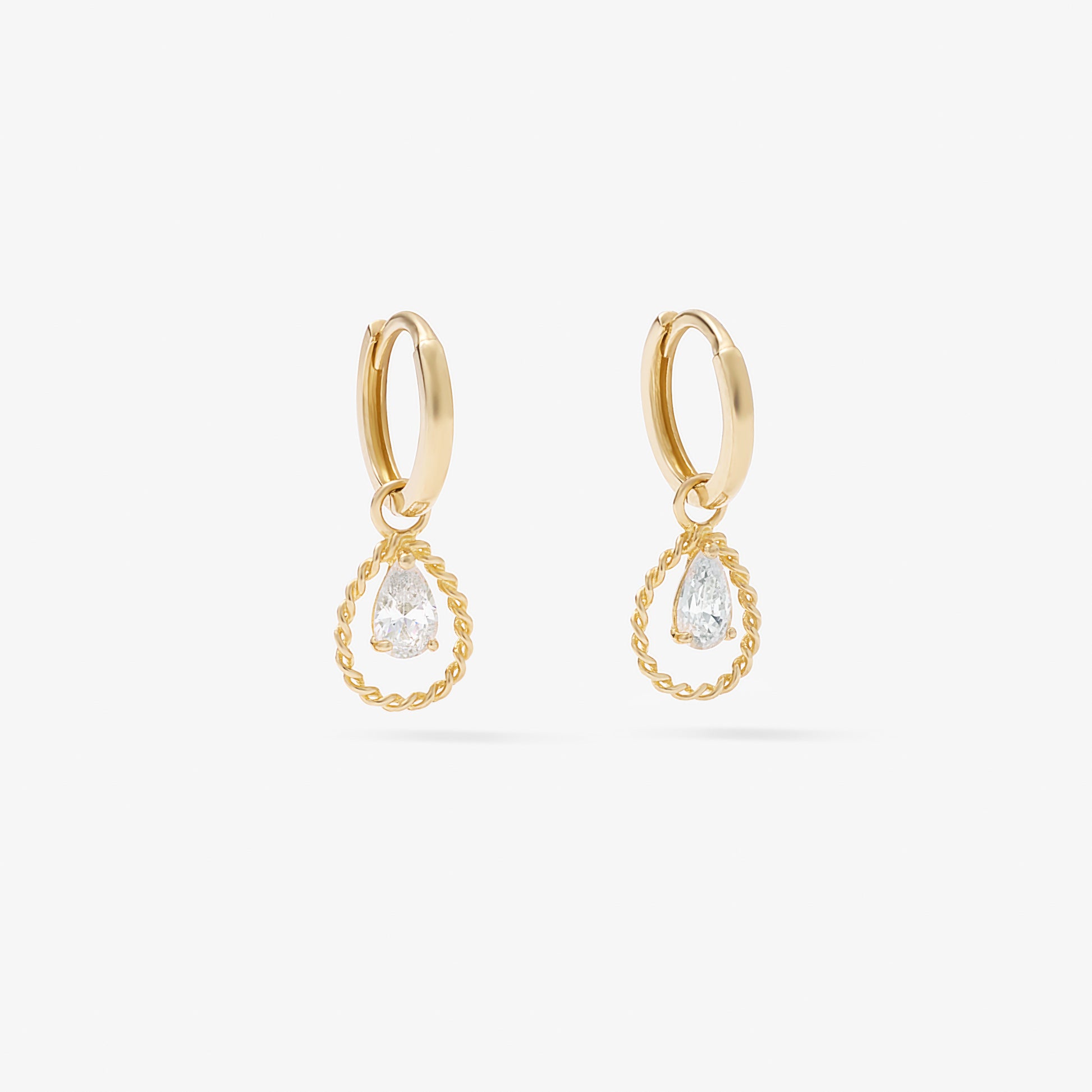 9K Yellow Gold Rope Open Teardrop And Pear Zirconia Charm Huggie Earrings