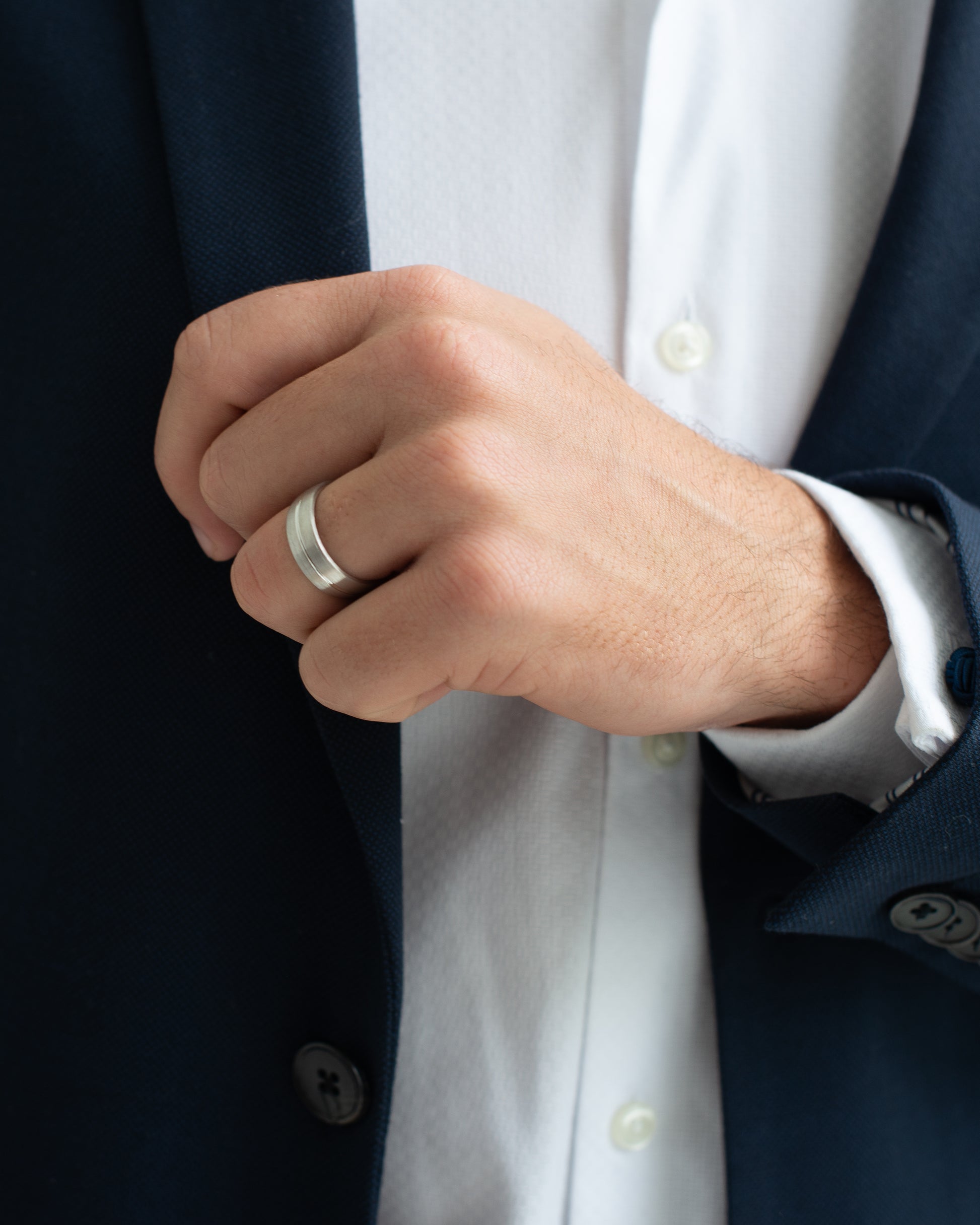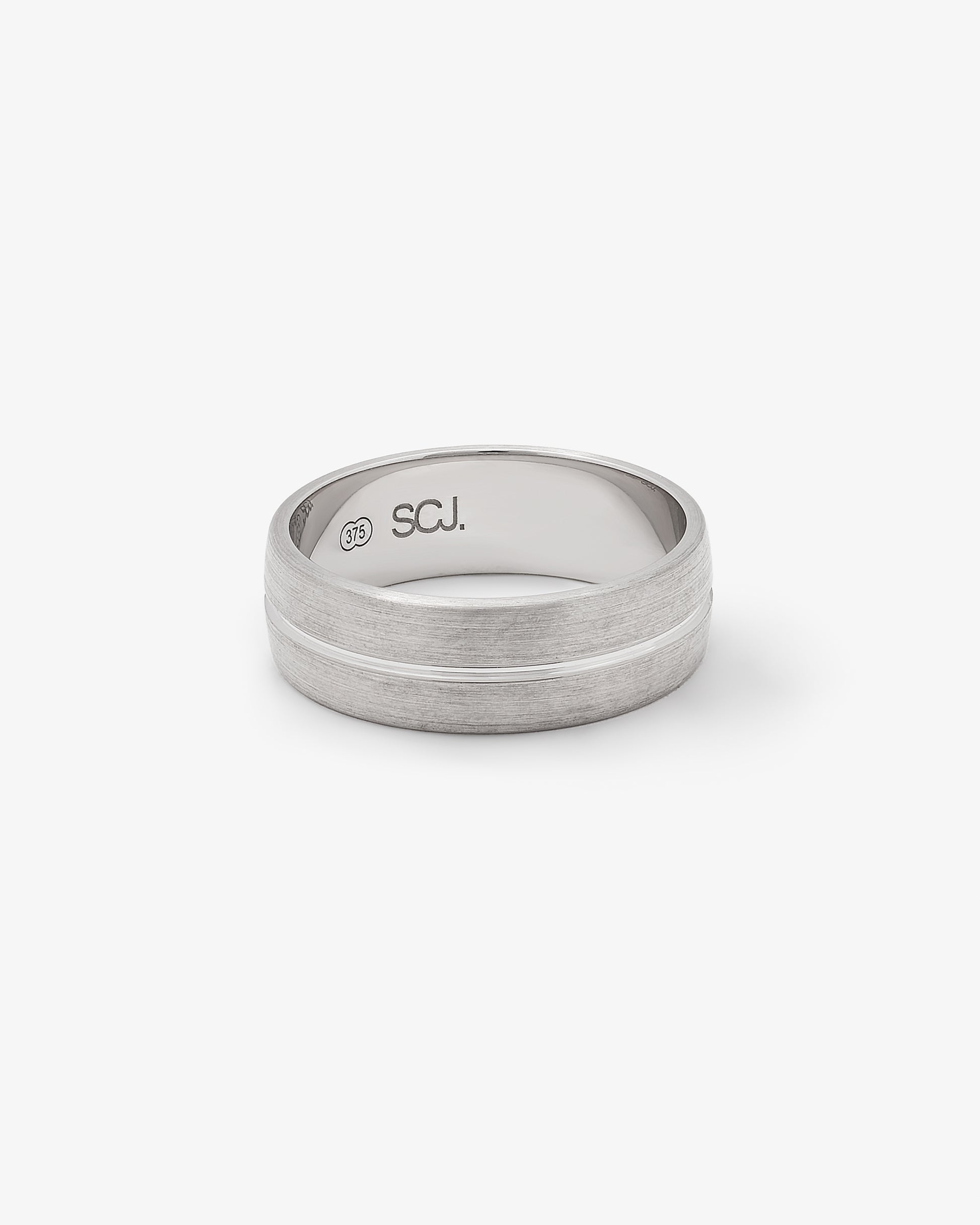 Crafted from 9K white gold, this 7 mm band ring blends modern style with timeless appeal. The brushed finish offers a sleek matte texture, while the polished centre line adds a refined contrast and subtle shine. Comfortable, durable, and effortlessly stylish, it’s an ideal choice for weddings, special occasions, or everyday wear.
