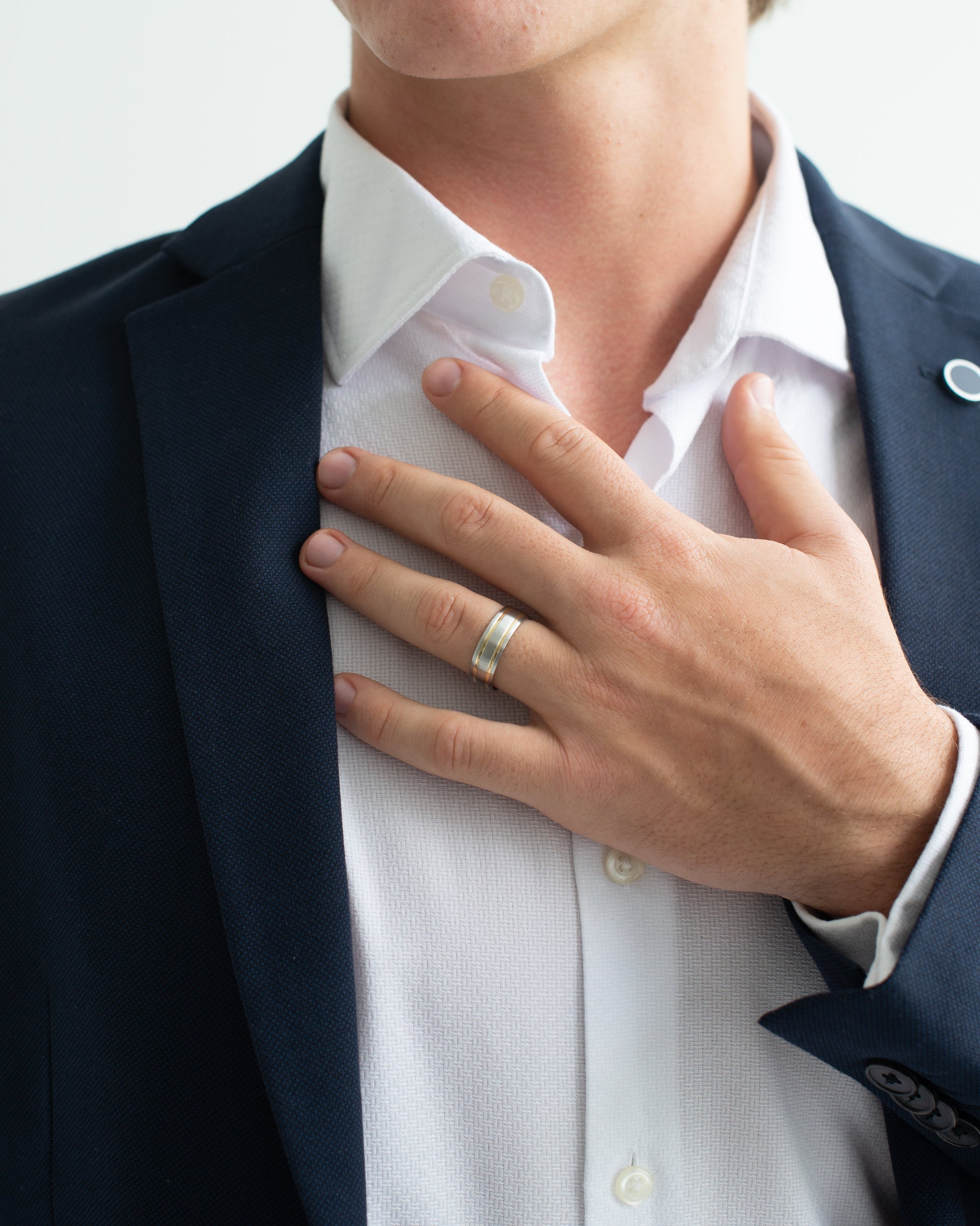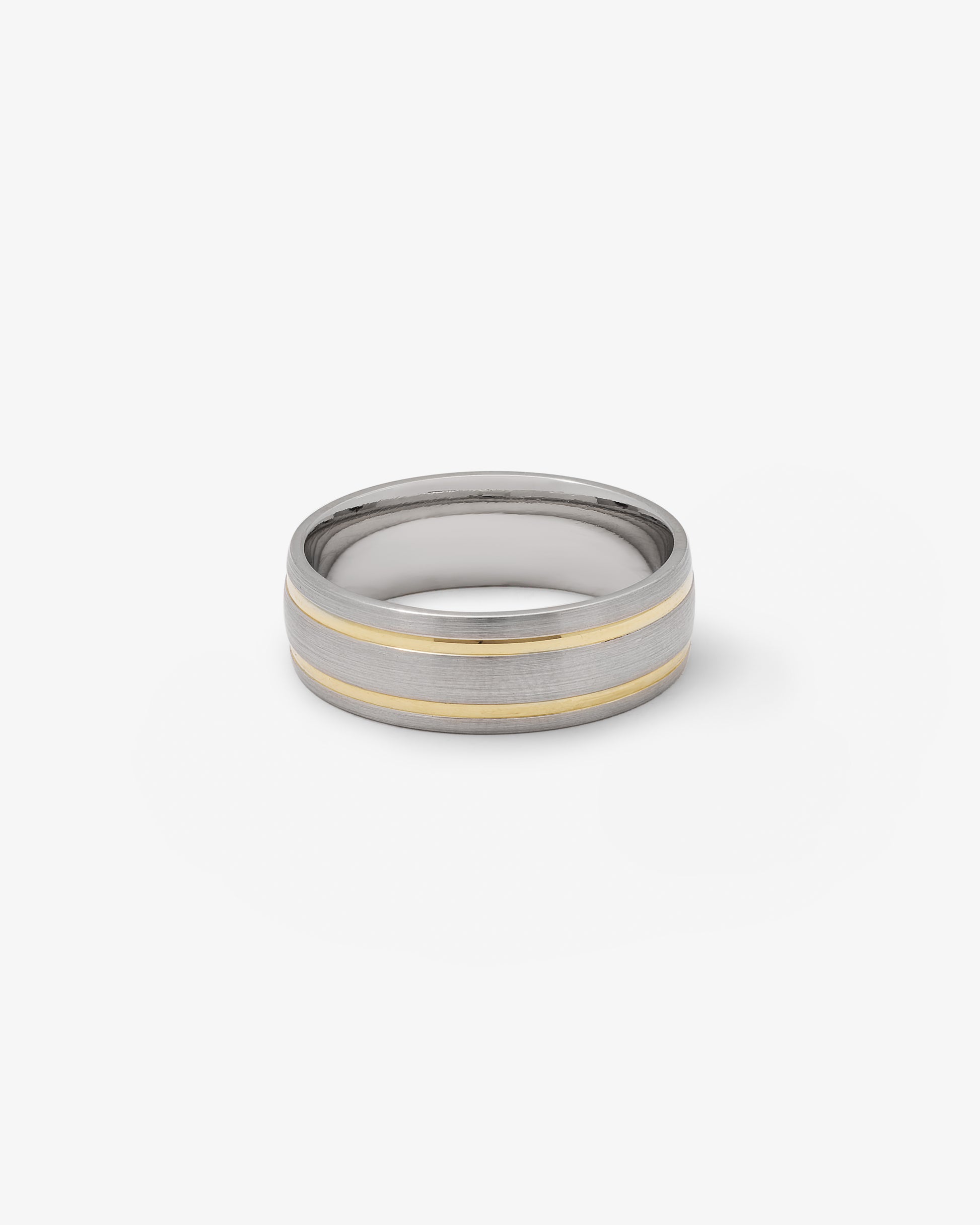 Crafted from cobalt chrome, this 7 mm brushed band features dual polished 9K yellow gold grooves for a striking contrast of texture and tone. Durable and contemporary, it’s a bold yet refined choice for everyday wear or a modern wedding band.