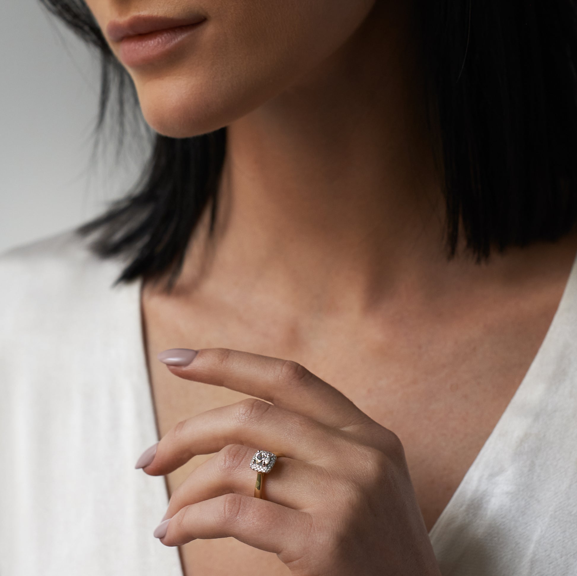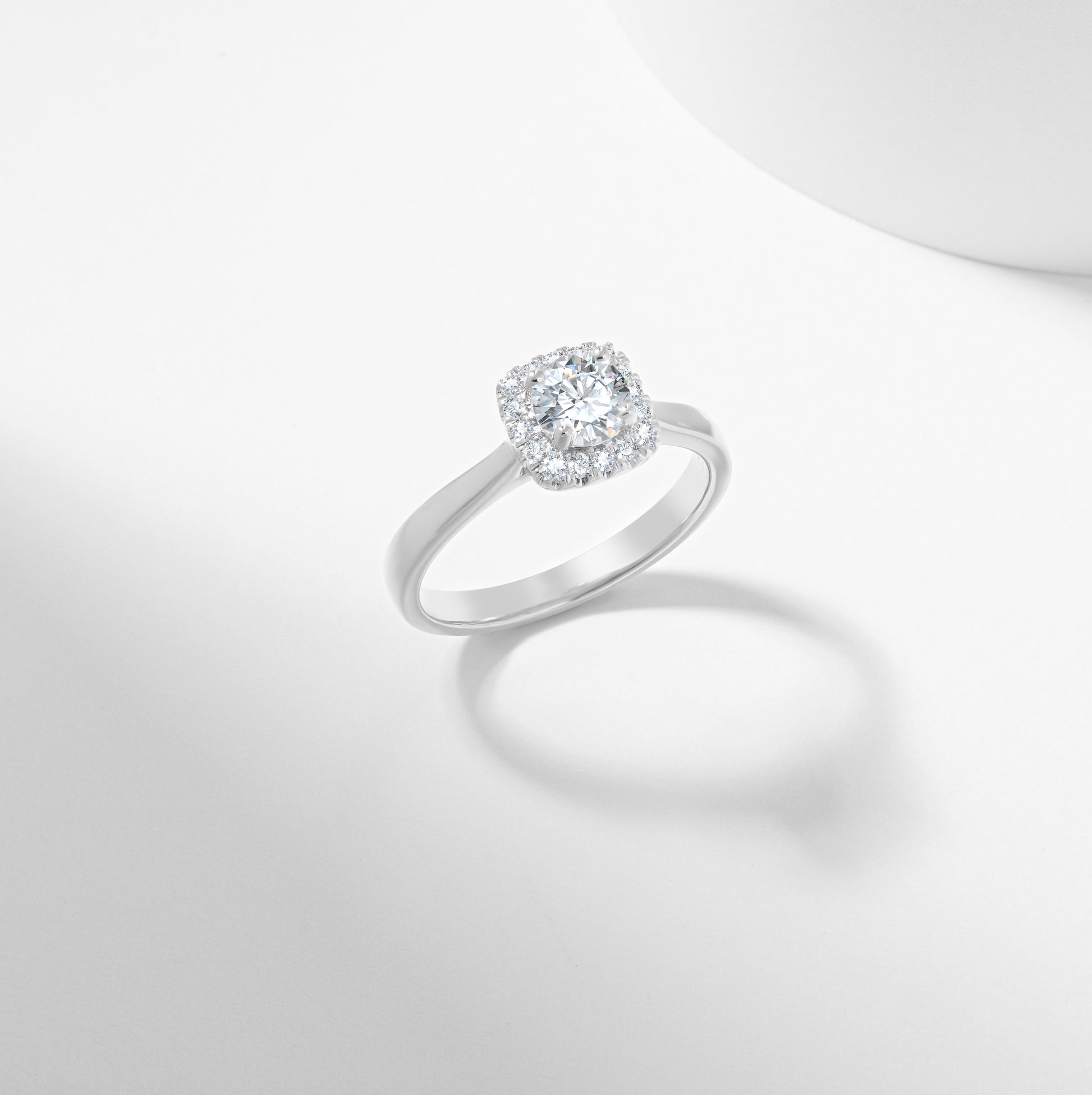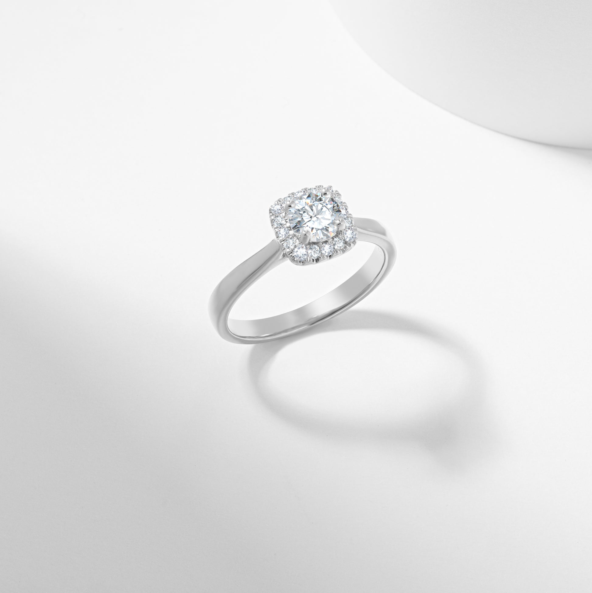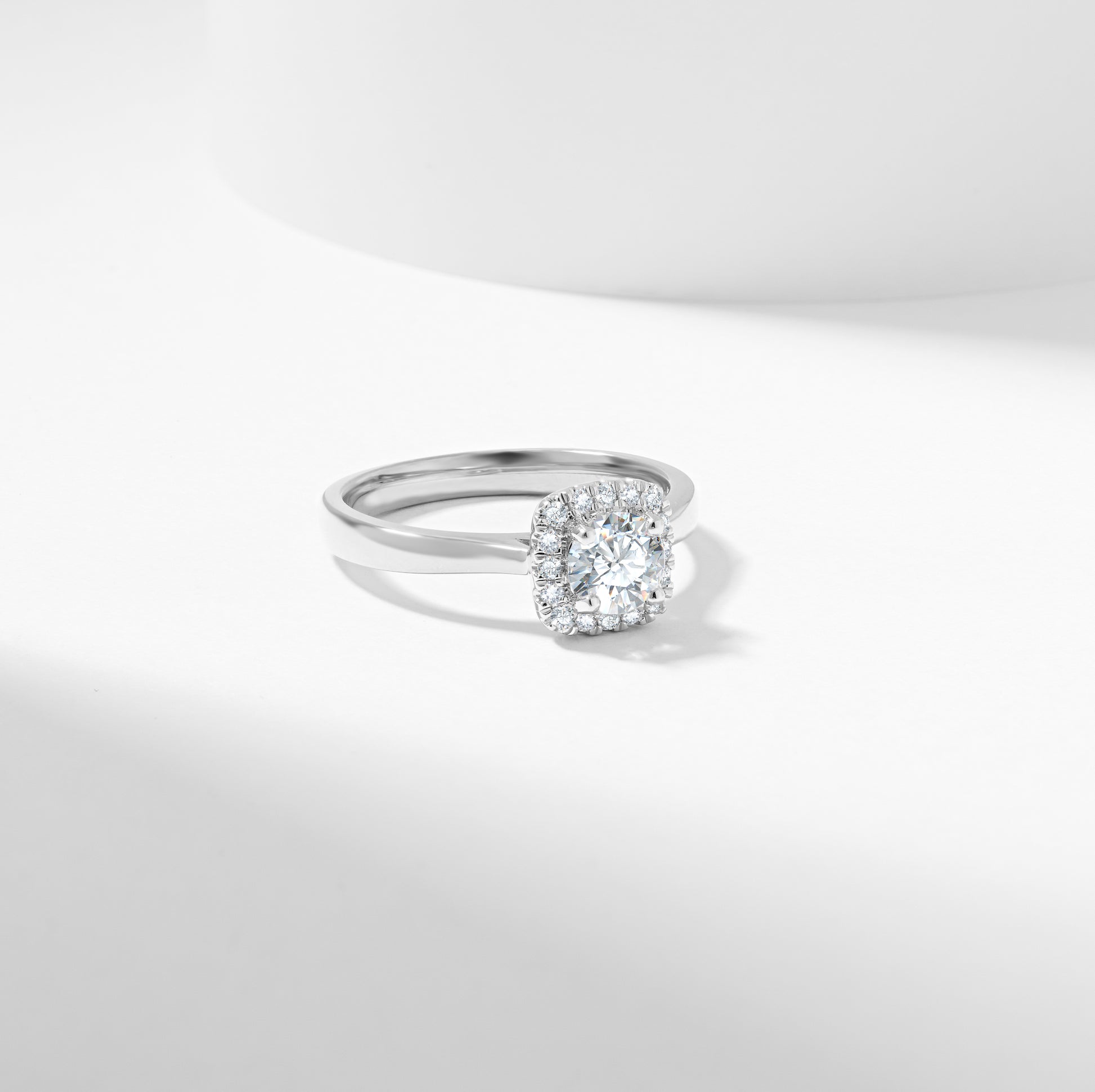 A 0.6ct round brilliant Diamond stands proud above a cushion halo of small round brilliant diamonds. Filigree under the setting adds a feminine touch, and the simple, reverse tapered band allow the diamonds to take centre stage.