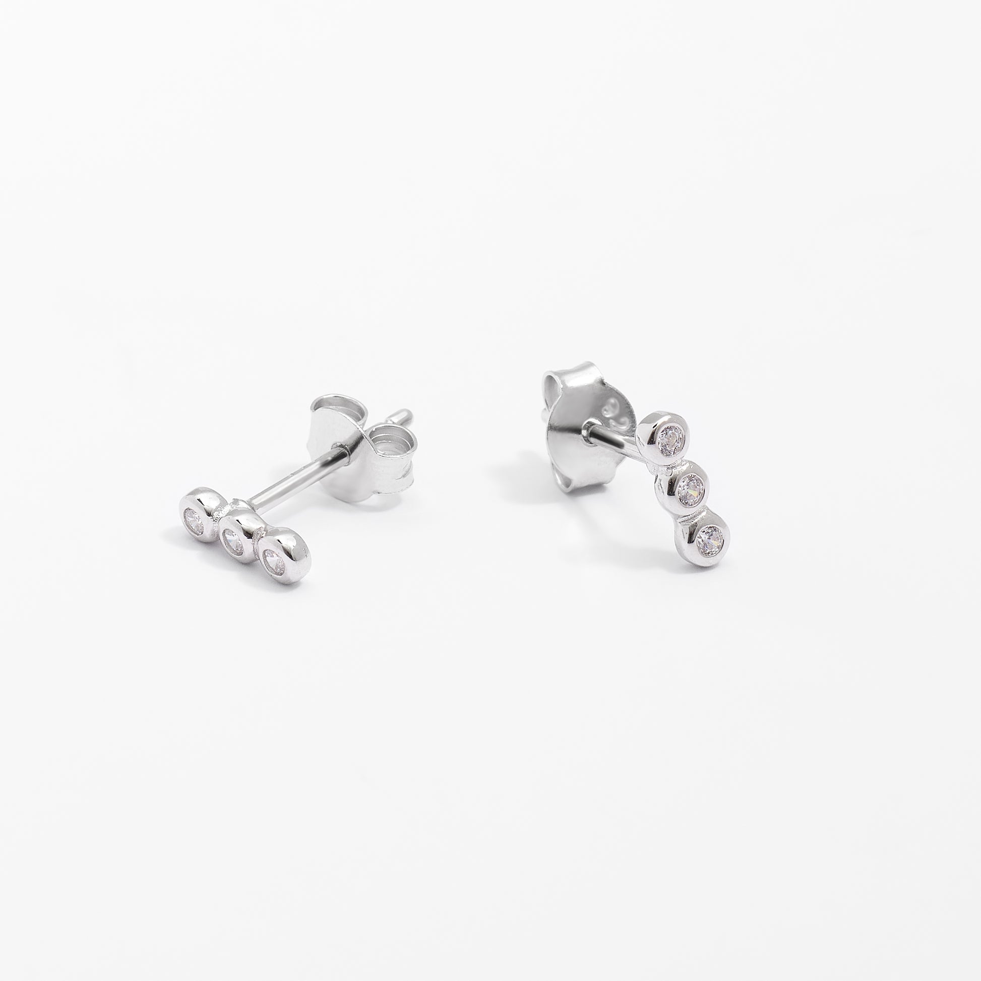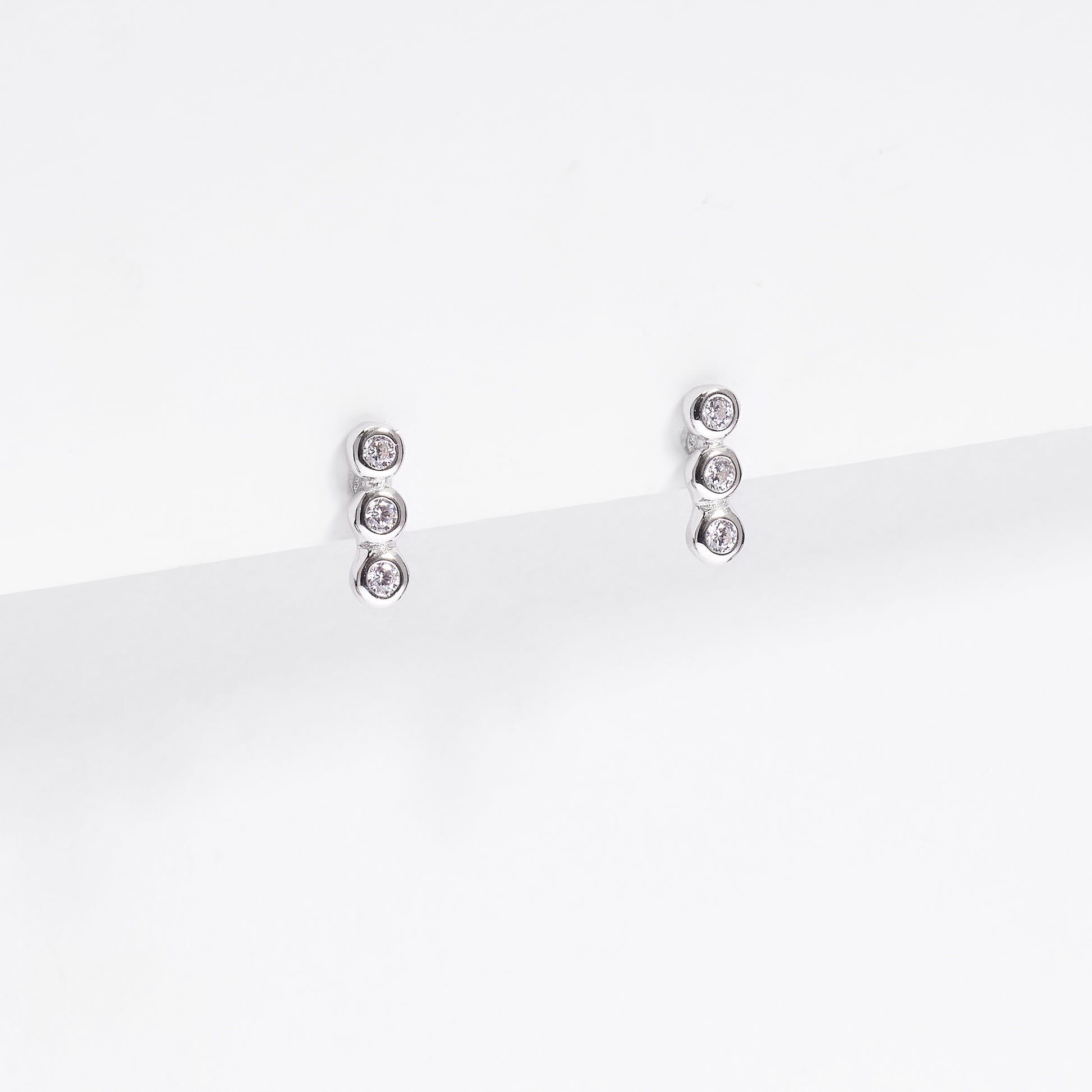 A cute petite pair of earrings, featuring 3 sparkling round brilliant bezel set zirconias in a row. They fasten with a centre post and push-on butterfly back.
