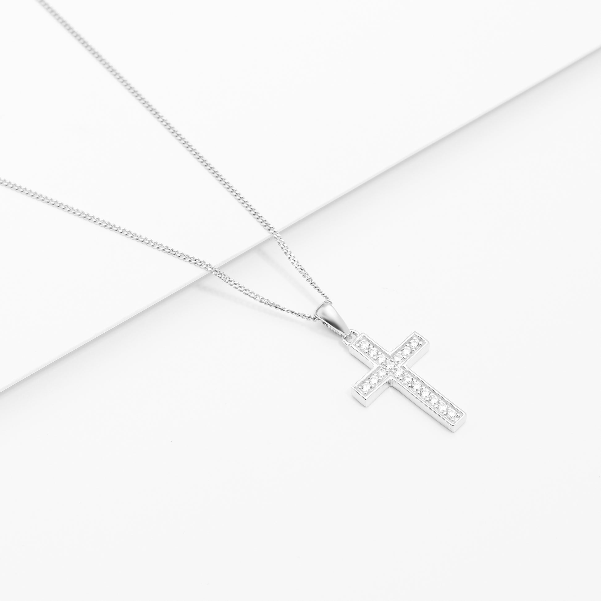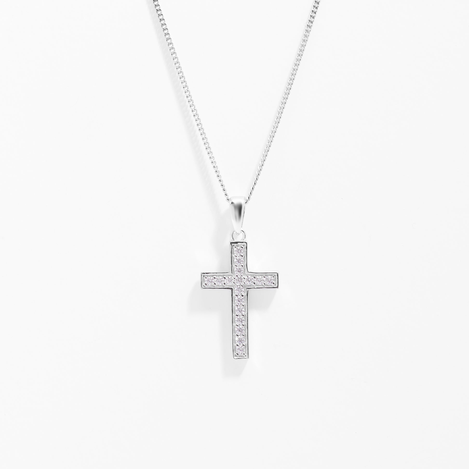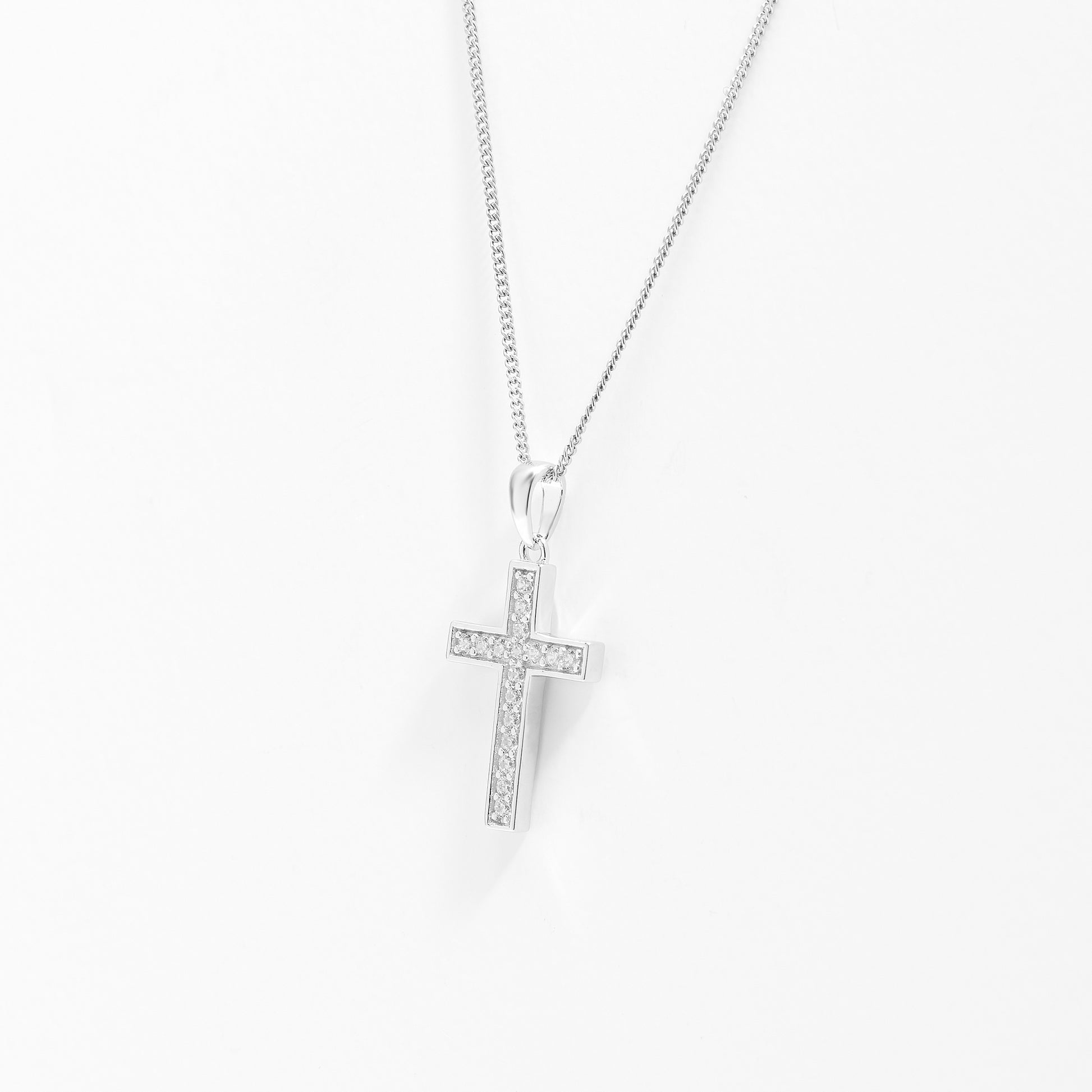 A stunning cross pendant set with dazzling round brilliant zirconias which catches the light and sparkles as you move. A 45cm sterling silver fine curb link chain is included.